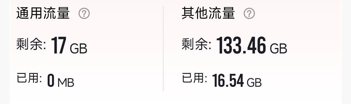 1.国内通用流量剩余 38.58GB (含上月结转国内通用流量 18.58GB ),专属流量(限指定 APP 或地点使用)剩余 1064.00GB ;